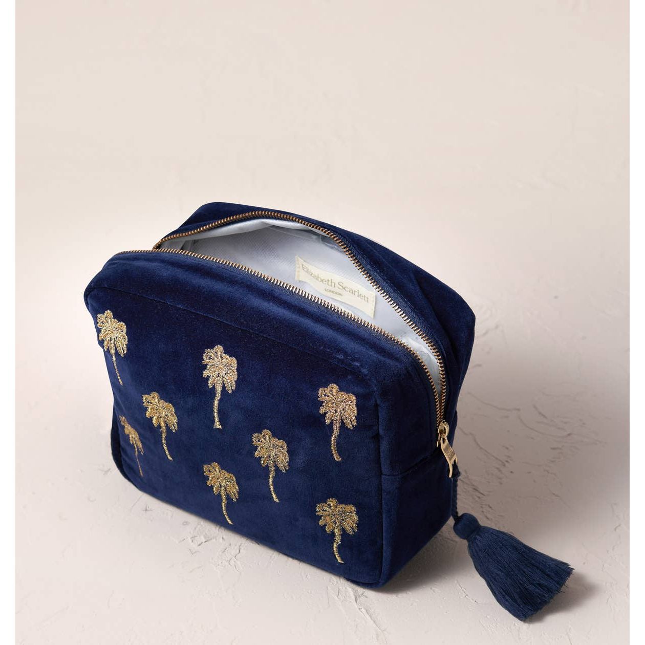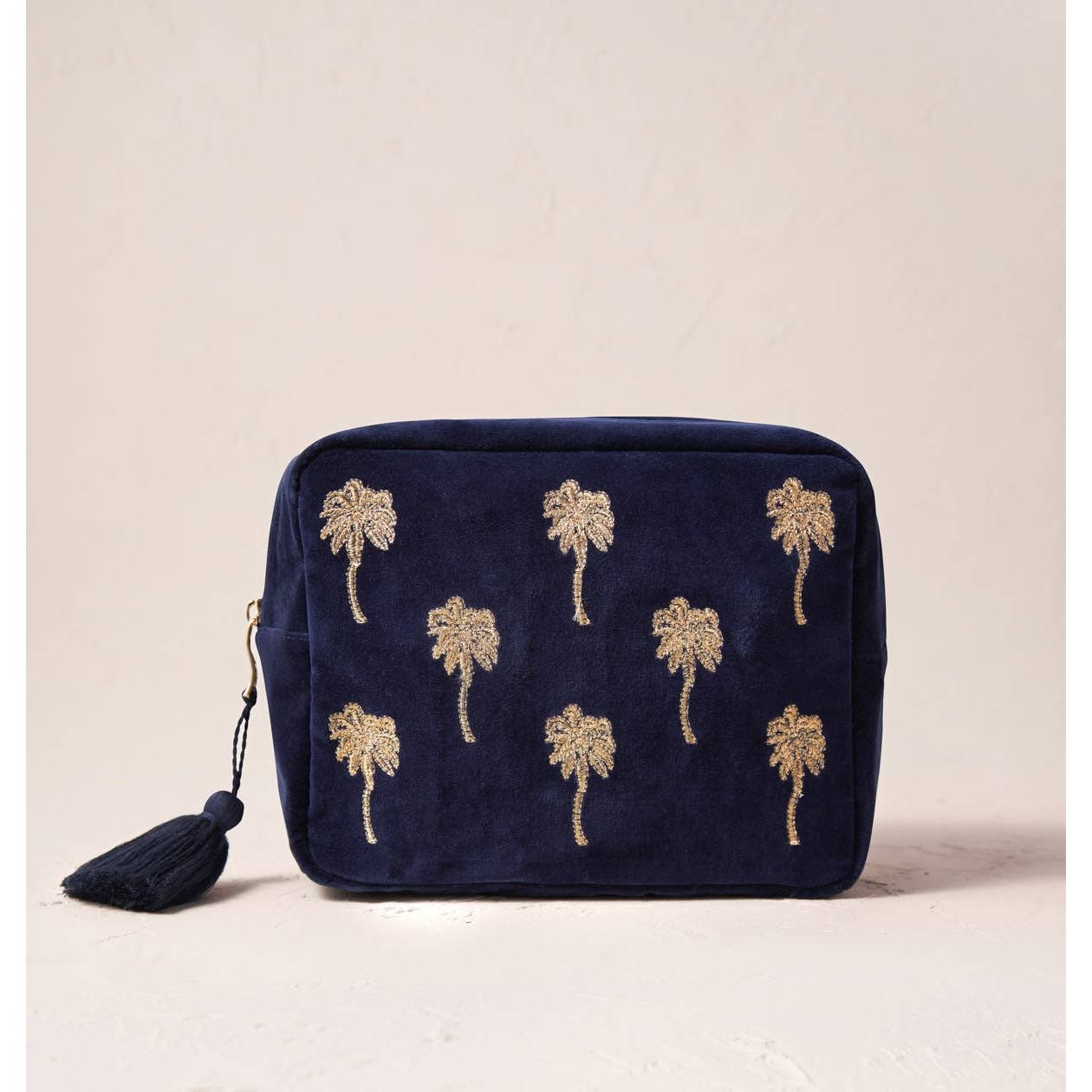 This golden palm design features glistening embroidery on a sumptuous navy velvet base. A symbol of escapism and idyl, these palm accessories are set to accompany your summertime adventures.