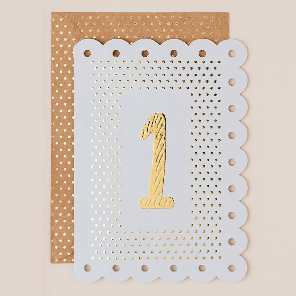 A beautiful 1st Birthday keepsake card with detailed metallic broderie edging.