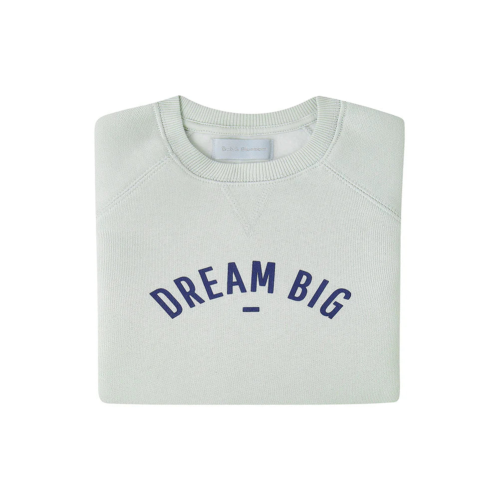 A relaxed, baggy style Pebble Grey sweatshirt with a navy 'DREAM BIG' print on front.