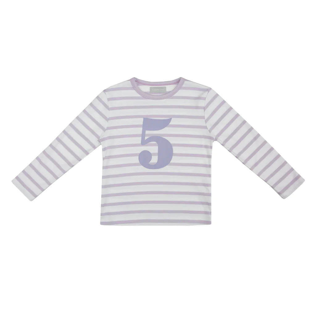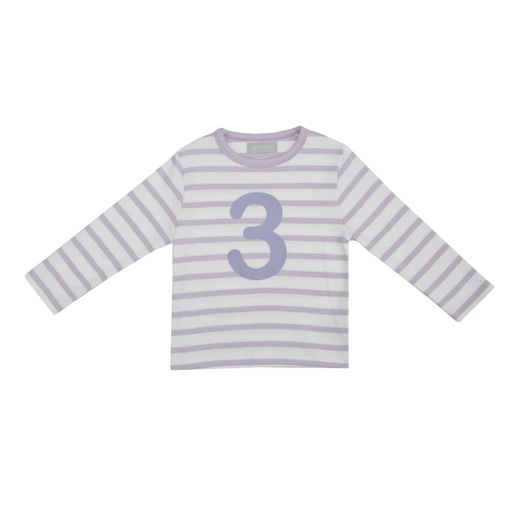 Parma Violet & white Breton striped cotton T shirt, featuring a hand screen printed number (age) with a round neck and long sleeves.