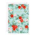 This sweet birthday card is filled with illustrations of deep red cherries set on a light blue background. It has been die-cut with a scalloped edge for a beautiful border. The 'Happy Birthday To You' greeting has been stamped with a luxe gold foil and the seeds on the flowers have also been gold foiled.