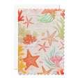 The stunning design features an ocean-inspired scene with a starfish, sand and coral printed with shimmering gold foil and a luxurious scalloped edge.