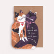 The perfect anniversary card or Valentine's card for a cat lover, this uniquely shaped greeting card is cut into the shape of two snuggling cats. The adorable cat cards are blank on the inside, ready for a handwritten romantic message to be added before being sent to a loved one.