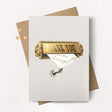 This greetings card features an ornate letterbox and a victorian style hand posting a note.