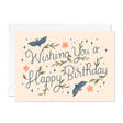 This birthday card features beautifully hand-drawn lettering with the greeting 'wishing you a happy birthday'. Set on a cream background, there are pretty flowers and beautiful illustrations of birds.