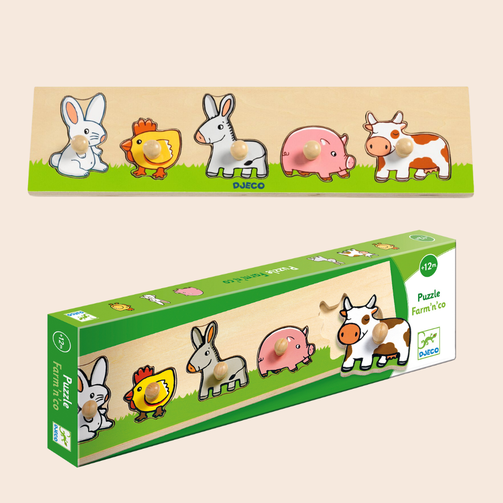 Farm'n’co is a farm-themed wooden puzzle, where each piece is super easy for little hands to grasp thanks to the chunky wooden knobs.