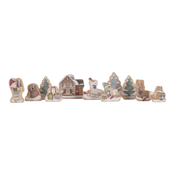 The set includes a house, festive characters, trees, a Santa sack, train and carriages, and tracks complete with bridge.