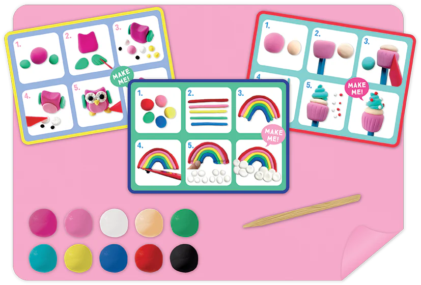 Become a master sculptor and creative genius with Clay & Play! Each set comes with 6 pots of 10 different air dry clay colours, 5 double-sided instruction cards (taking you step-by-step through the creative process), a brightly coloured silicone mat and a handy wooden stylus tool for crafting.