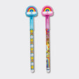 They feature a colourful design and rainbow-shaped erasers on top of the lids.