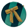 A jewellery travel pot, made from recycled materials, in a marine and teal striped print with a detachable, gold bow brooch.