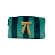 A stunning teal and marine striped velvet make-up bag, with a teal trim and a detachable, bow shaped brooch.