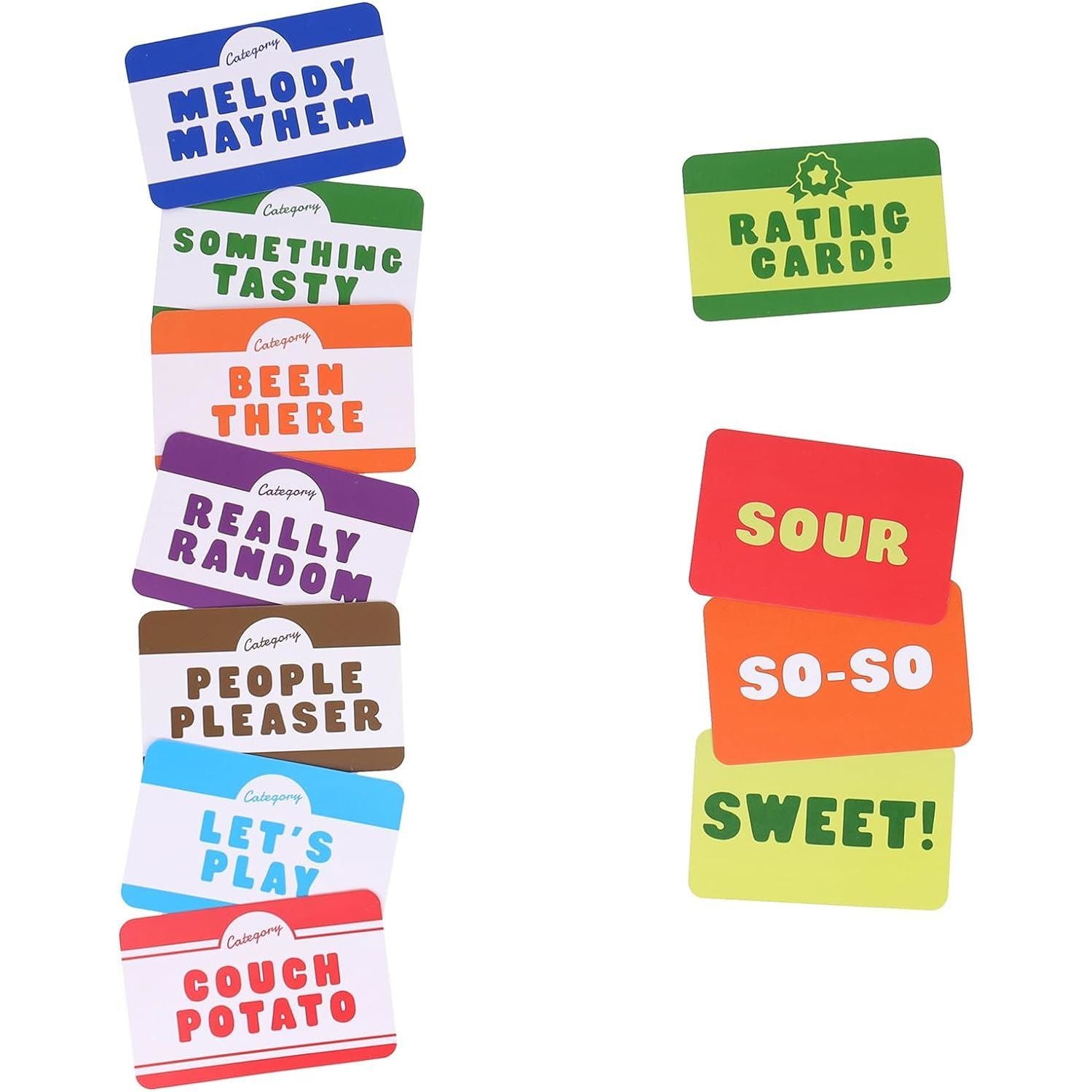 Pick a card from one of eight categories: Melody Mayhem, Something Tasty, People Pleaser, Let's Play, Really Random, Couch Potato, Been There, and (for the grownups) Risky Business. Present your opinion, select your rating and see who can be the first to win the card.