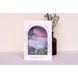 A really beautiful and unique arch window card, with hand illustrated landscape view and the words 'Thinking of You'.