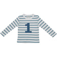 Ocean blue & white Breton striped cotton T shirt, featuring a hand screen printed number (age) with a round neck and long sleeves.