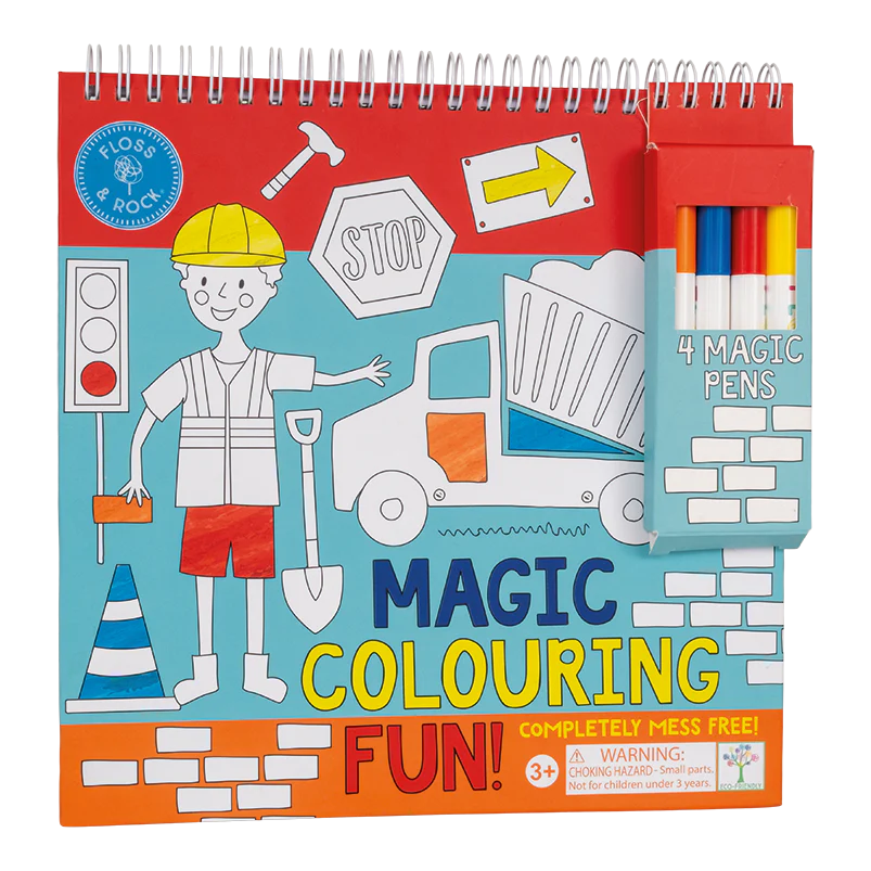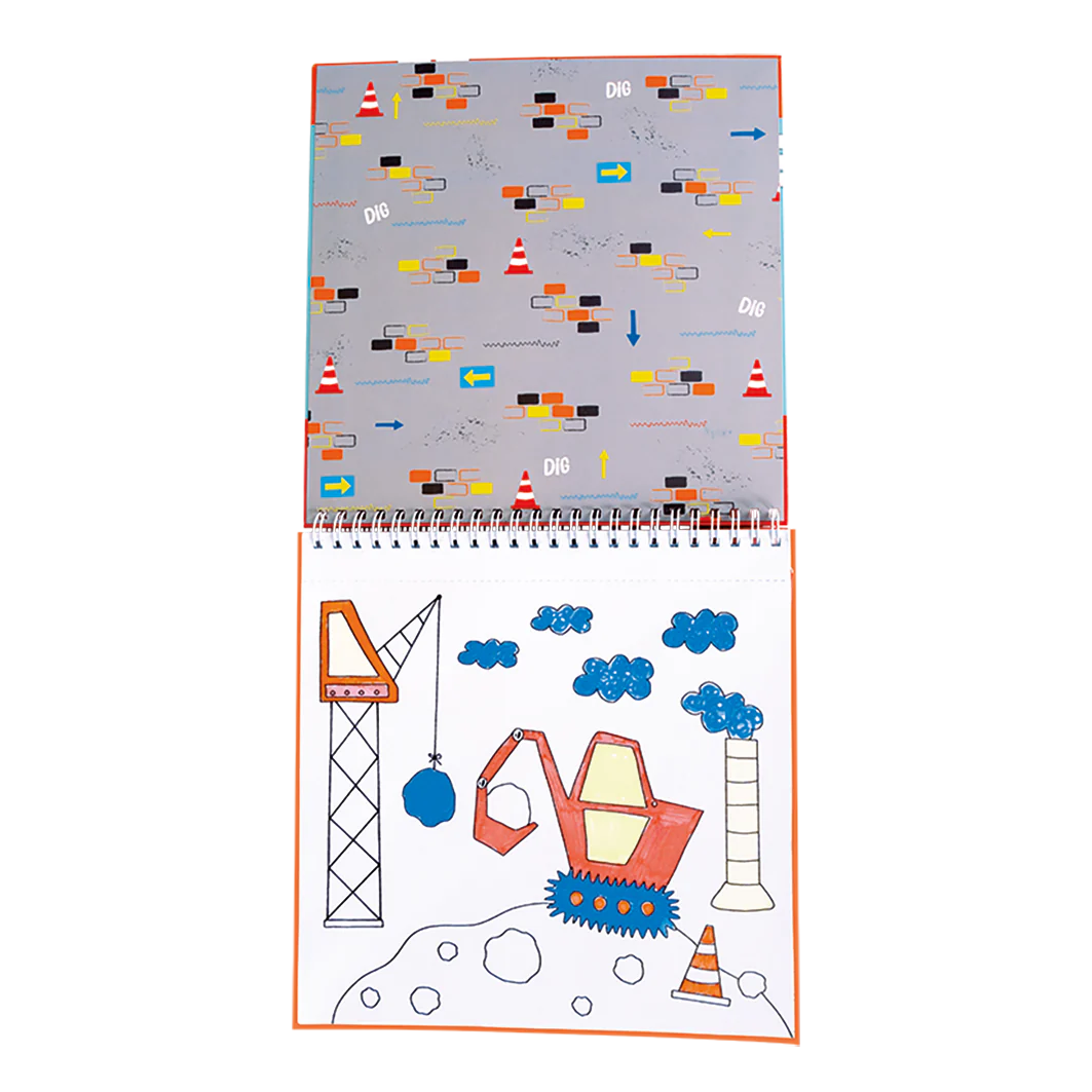Each spiral bound pad contains 4 magic pens and 8 colouring pages, this Construction design has diggers, builders, cranes, cones and more.