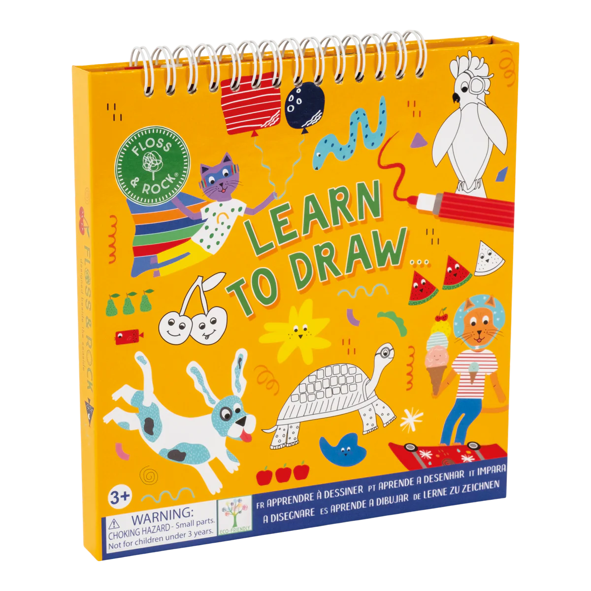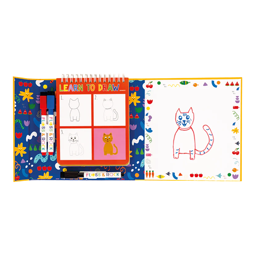 Open the book to reveal 8 thick glossy pages, 3 colour dry wipe pens with erasers and a draw and colour section to copy the image. Each page has a 3 step guide as to how to draw your masterpiece! The book folds almost flat with a magnetic closure and is perfect for travel and taking out and about. Reusable over and over again.