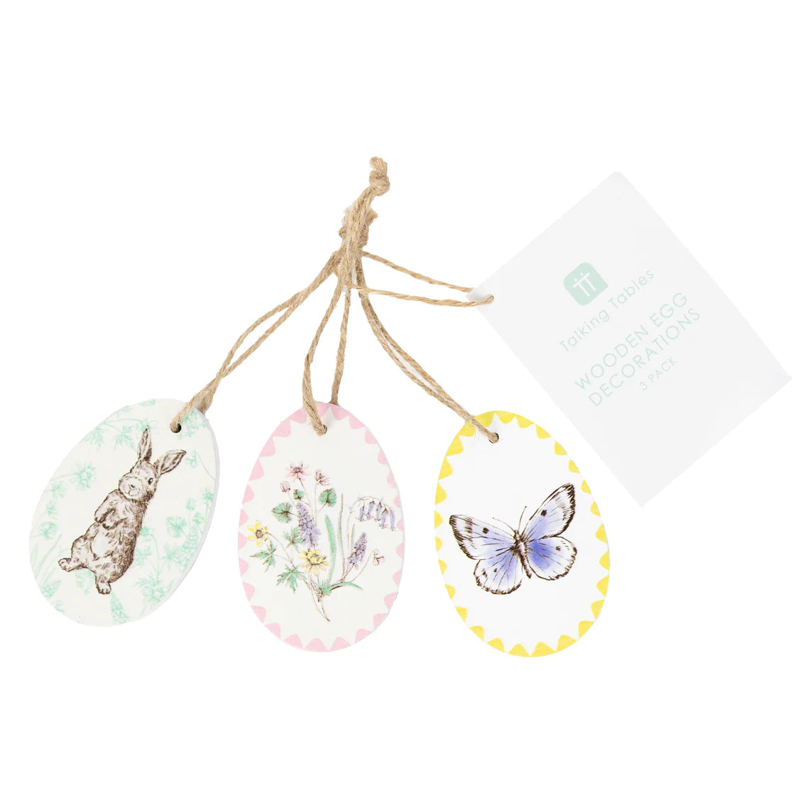 Pack size: 3 wooden hanging decs – 1 x rabbit, 1 x butterfly and 1 x wildflower printed design