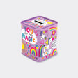 This colourful money tin for children has a slit in the top to put coins through and a removable tin base.