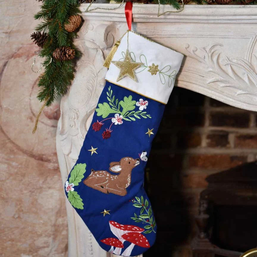 In a gorgeous dark blue colour, this winter stocking has an embroidered enchanting forest scene with a young deer, red and white toadstools, gold stars, flowers and leaves.
