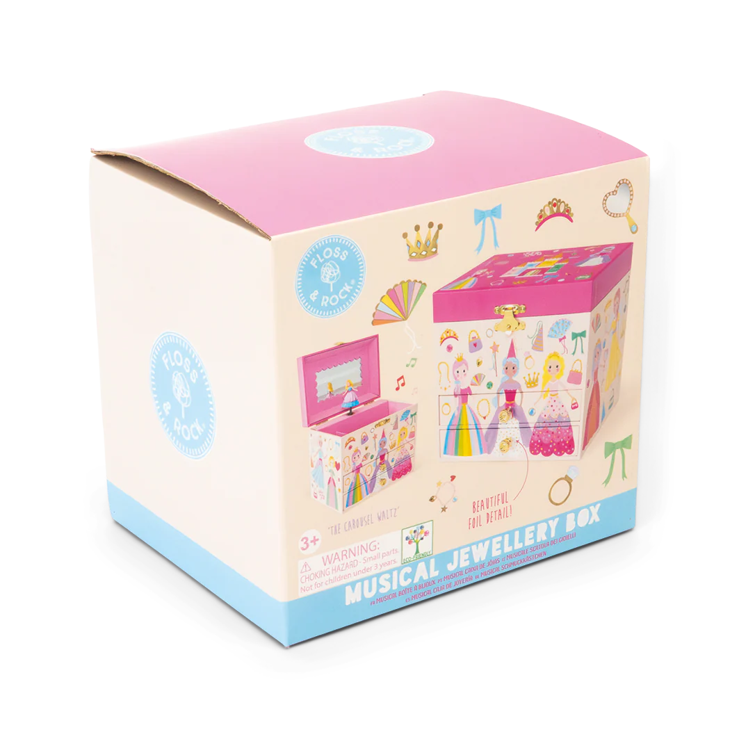 This Musical Jewellery Box is fit for a princess! Covered with gorgeous princesses and shiny foil details, twist the winder at the back to hear the 'carousel waltz' play as the princess inside spins around.