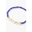 Electric blue faceted bead bracelet adorned with beads that spell-out 'HAPPY'.