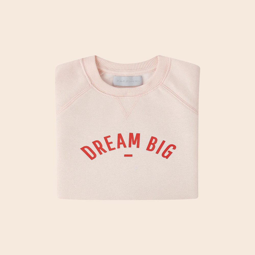A relaxed, baggy style Powder Pink sweatshirt with a red 'DREAM BIG' print on front.