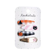 Our set of four fabric covered snap clips feature the cutest Halloween embroidered motifs, including a witches hat, a black cat, a pumpkin and a star. These clips are perfect to add a little fun to any Halloween plans!