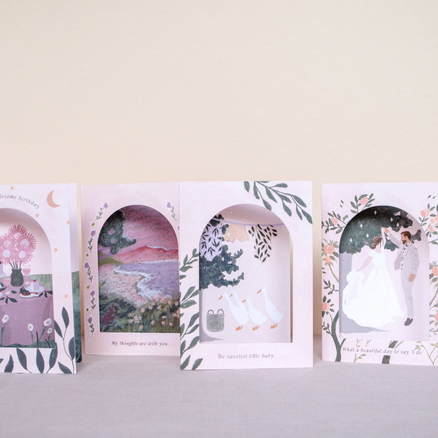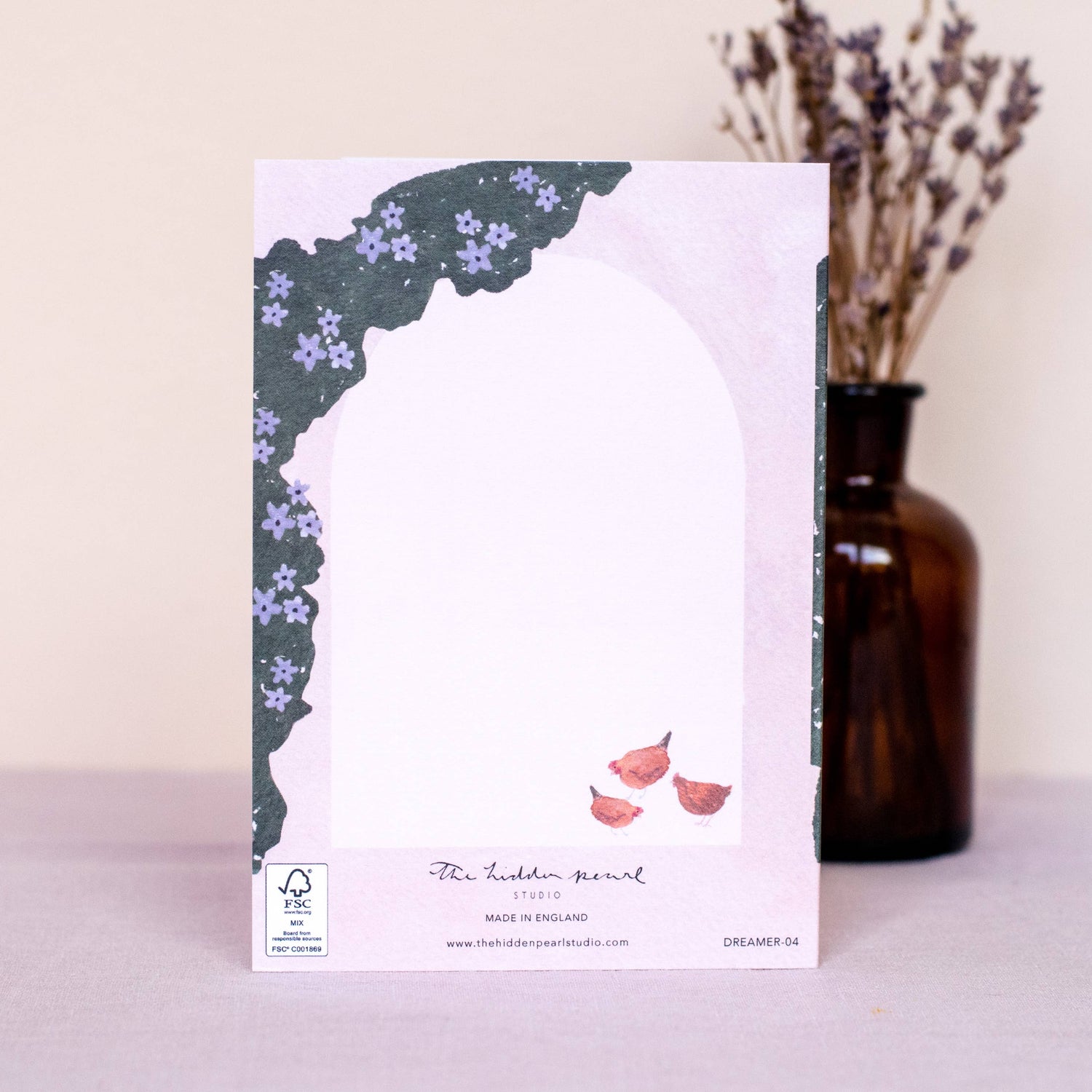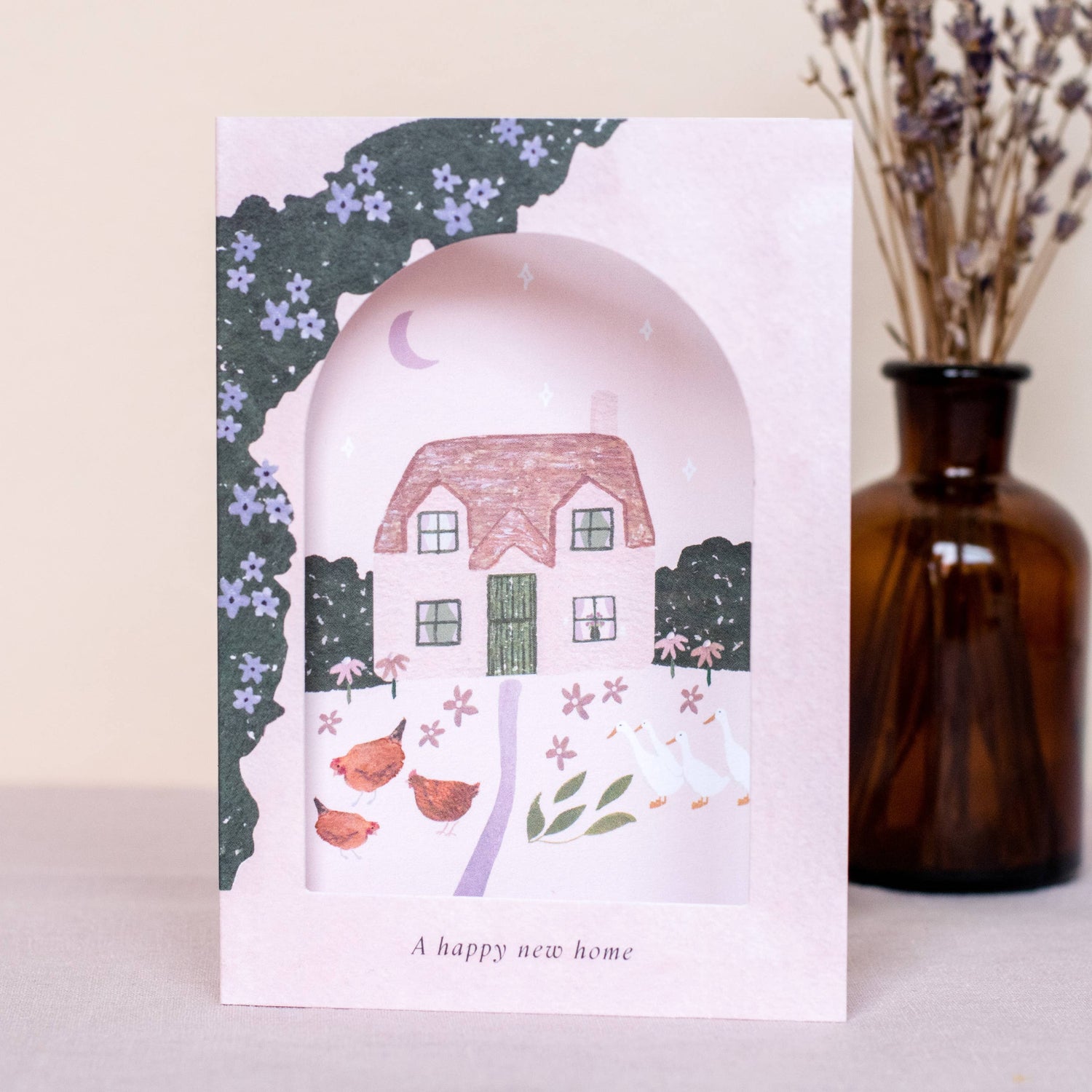 A beautifully designed arch window greeting card with 'Happy New Home' text and a cottage with chickens. Dreamy!